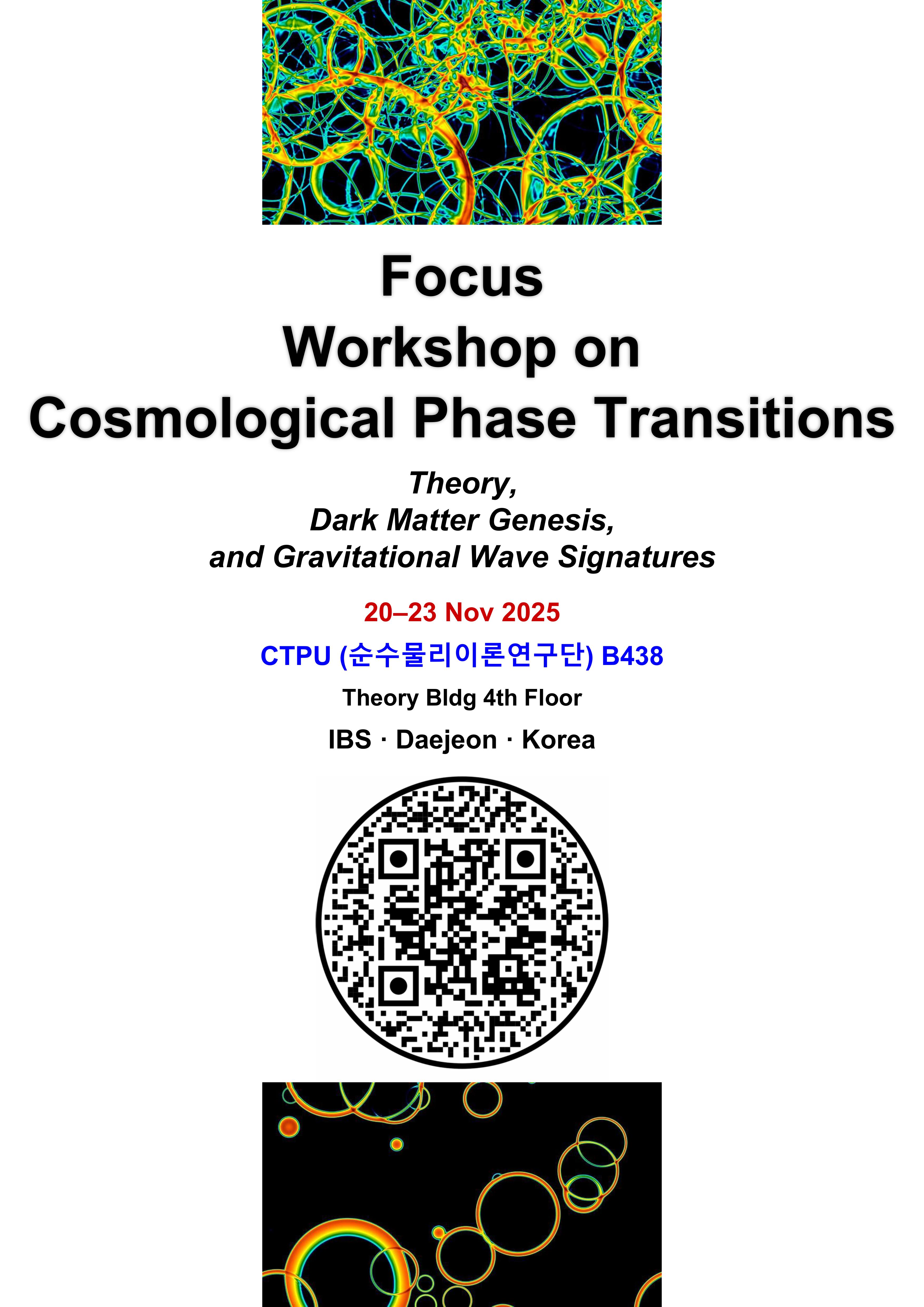 The Focus Workshop on Cosmological Phase Transitions: Theory, Dark Matter Genesis, and Gravitational Wave Signatures brings together leading experts to explore one of the most fascinating frontiers in modern particle physics and cosmology. This intensive workshop will focus on the theoretical foundations of cosmological phase transitions in the early universe, examining how these fundamental processes may have generated the dark matter that dominates our cosmos today and produced detectable gravitational wave signatures that could revolutionize our understanding of the universe's earliest moments. Through in-depth presentations and collaborative discussions, participants will explore cutting-edge research that connects quantum field theory, particle physics beyond the Standard Model, and observational cosmology, with a particular emphasis on how upcoming gravitational wave detectors and dark matter experiments may provide unprecedented insights into the physics of phase transitions.